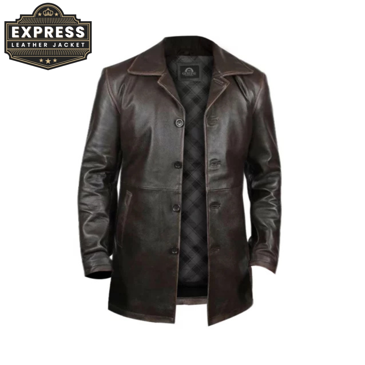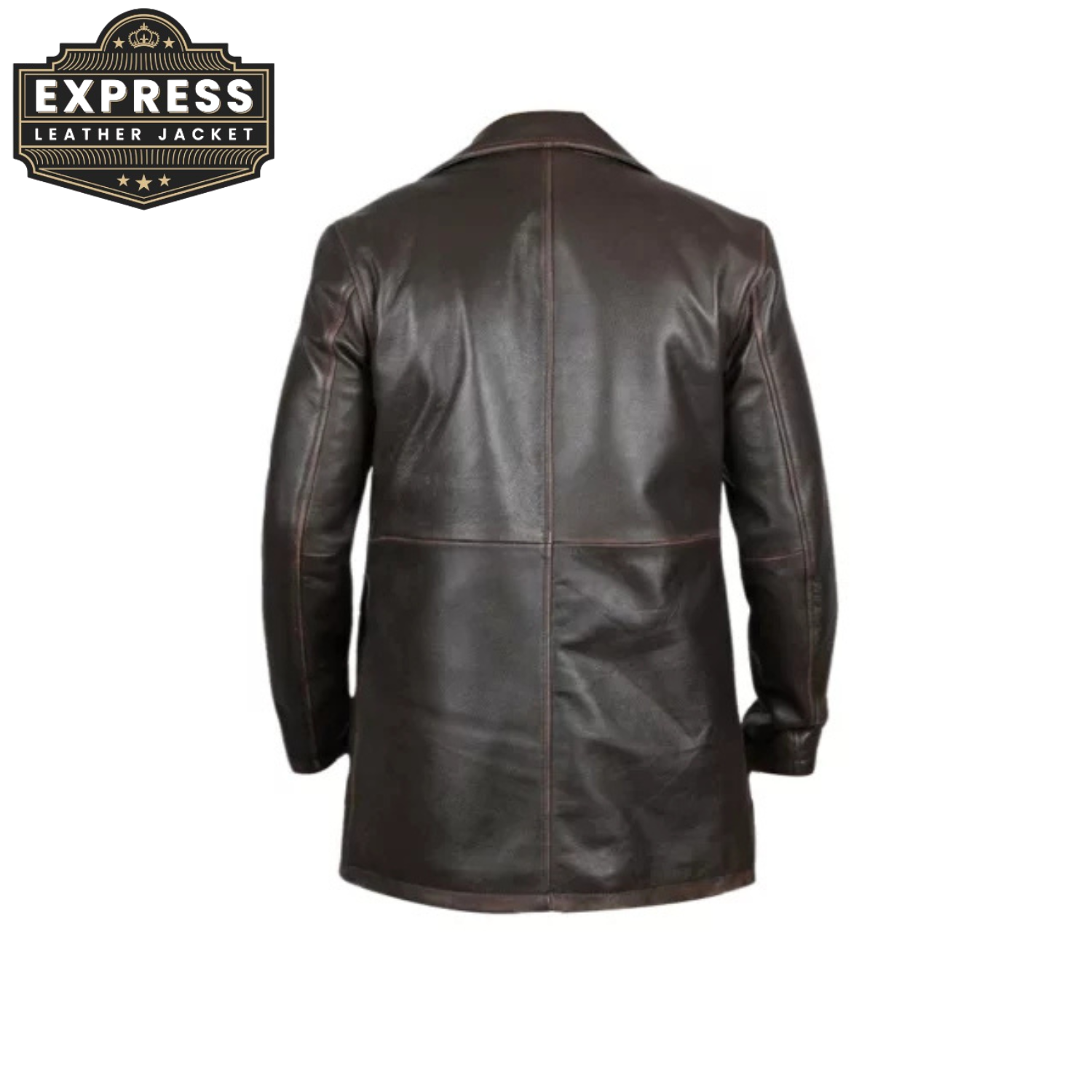The men’s brown leather coat features a classic long style, button-front closure, and a sleek collar design that enhances its versatile appeal. Its smooth finish and fine stitching make it stand out as a wardrobe essential, while the soft inner lining ensures warmth and comfort during colder seasons.