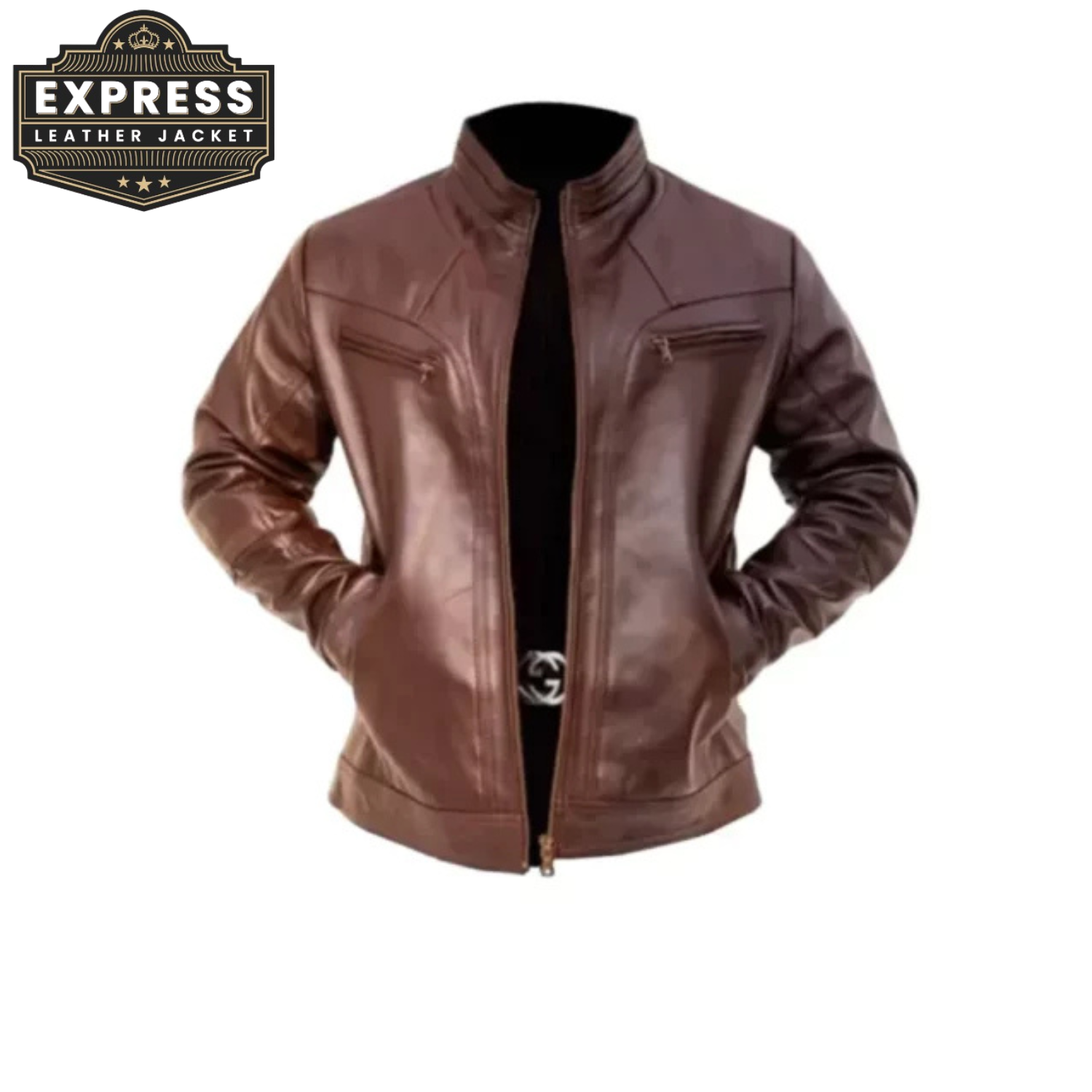 This brown cafe racer jacket for men features a sleek front zipper closure, snap-tab stand collar, and finely detailed stitching that enhances its vintage appeal. The rich brown tone adds a versatile touch, making it suitable for both casual and semi-formal outfits. The jacket also includes multiple zippered pockets that provide both practicality and style, while the smooth inner lining ensures all-day comfort and warmth.