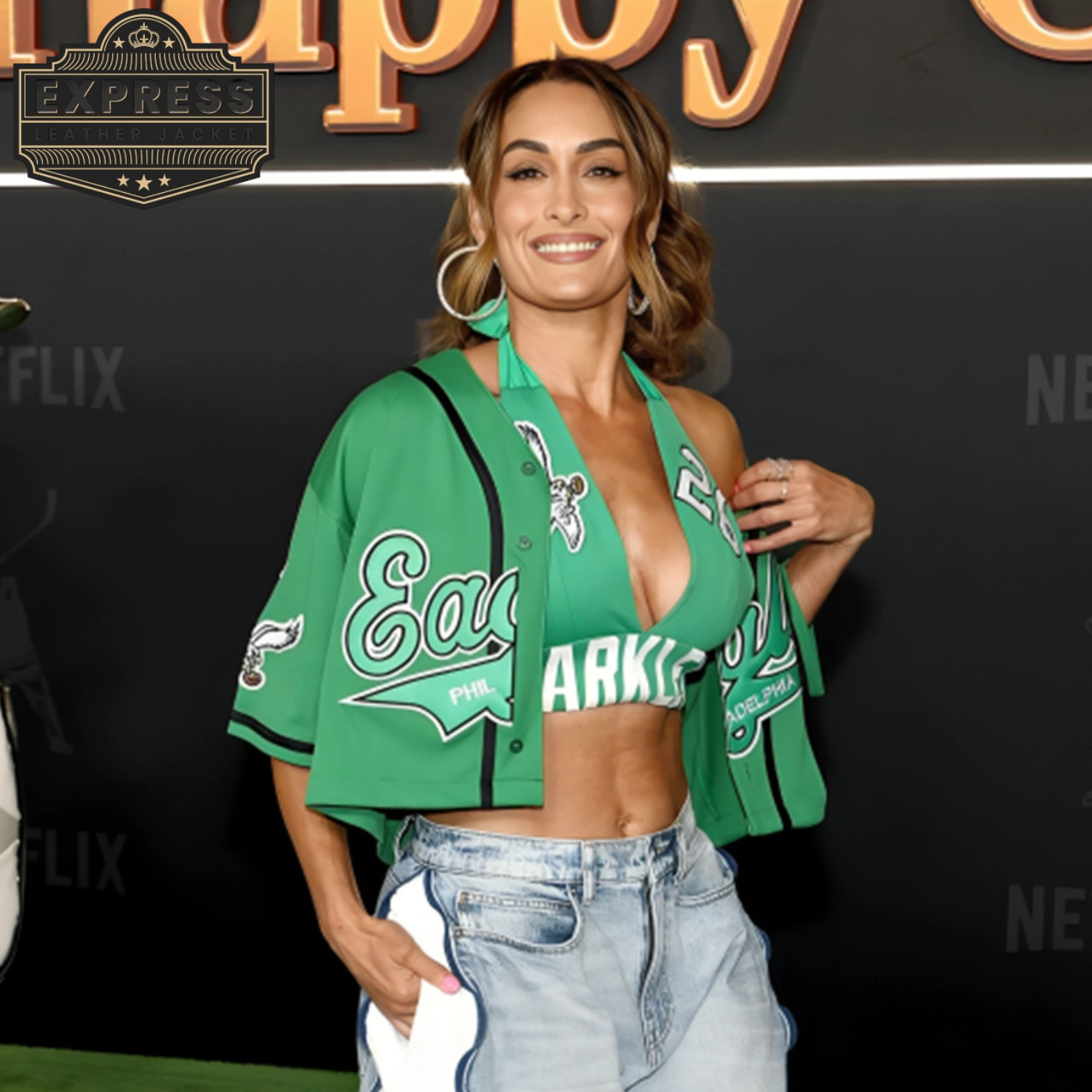 This celebrity cropped jacket is designed for fans of Nikki Bella and fashion enthusiasts who want to bring star-inspired looks into their everyday wardrobe. Available in all standard sizes with worldwide shipping, it’s time to own this must-have Nikki Bella Eagles cropped green jacket today!